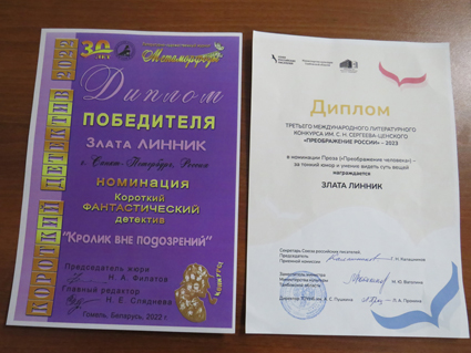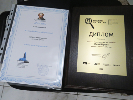 Юлия Шутова предъявила нам два диплома: 1) Диплом дипломанта Всероссийской литературной премии имени А.К.Толстого за книгу прозы «Вот вы и вернулись» (Саратов: Амирит, 2023); 2) Диплом премии «Русский детектив» в номинации «Дебют года» за книгу «Раз, два, три, четыре, пять, я иду искать» (М.: ЭКСМО, 2023) (https://fantlab.ru/edition383266).