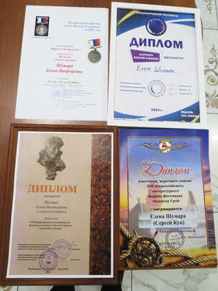 Елена Шумара просто завалила нас своими наградами. Я насчитал шесть: 1) Диплом лауреата премии имени Виктора Голявкина за 2023 год в номинации «Проза для взрослых» за книгу «Если я буду нужен» (М.: АСТ, 2021) (https://fantlab.ru/work1317694); 2) Диплом лауреата II степени V Международного фестиваля «Всемпоэзии» за 2023 год; 3) Диплом VIII Международного фестиваля-конкурса «Русский Гофман» в номинации «Поэзия» за 2023 год; 4) Диплом участника «короткого списка» XIII Российского литературного форума-фестиваля «Капитан Грэй» за 2023 год; 5) Диплом и приз лауреата поэтического конкурса Фестиваля искусств «Улица Блока» за 2023 год; 6) Диплом за творческую свободу, смелость и новаторство в стихосложении в номинации «Сосноровская ветвь» поэтического конкурса Фестиваля искусств «Улица Блока» за 2023 год.