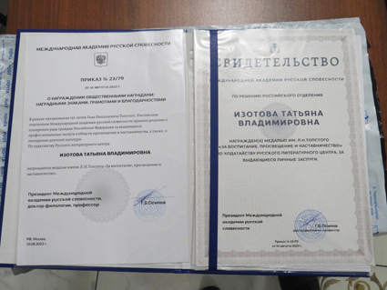 5 – Татьяна Берцева с дипломом премии «Дверь в лето»; 6 – Медаль имени Л.Н.Толстого; 7 – Документы к медали; 8 – Благодарственное письмо и благодарность
