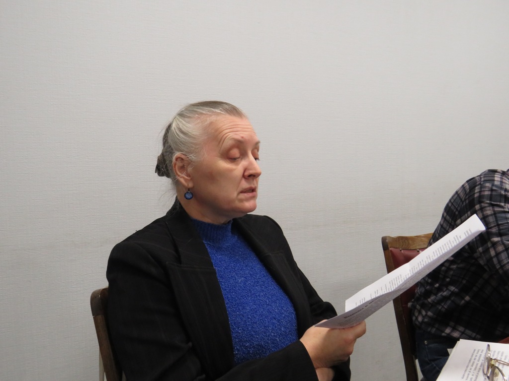 И наконец староста Студии Татьяна Берцева со свойственным ей артистизмом зачитала рассказ "Маленький хозяин" — об отчаявшейся женщине Арине, которая пришла в старый дом на холме в поисках домового и в надежде наконец-то наладить свою непутевую жизнь.