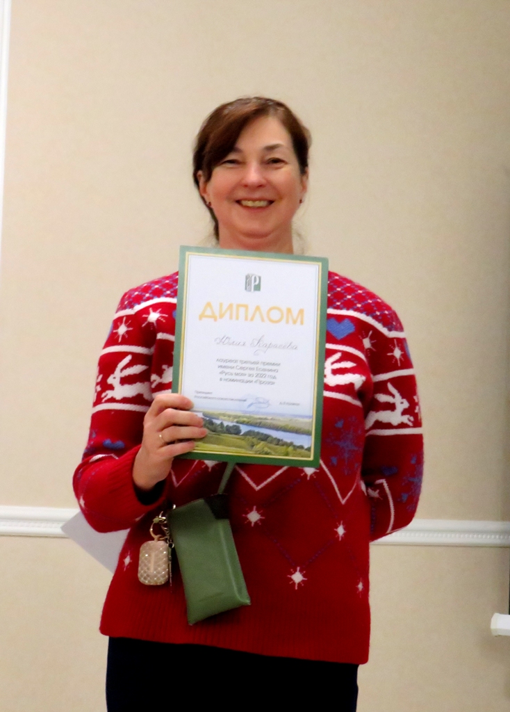 И наконец начался собственно «парад» лауреатов. Первой на "сцену" вышла недавно принятая в Союз писателей Санкт-Петербурга Юлия Шутова. На ее боевом счету в прошлом году было три достижения: 1) третье место на конкурсе Российского союза писателей "Русь моя" за рассказ "История прабабки"; 2) три номинации на литературном конкурсе корпорации "Заслон" и ЛитРес "Проект особого значения" у фантастического рассказа "Ген бессмертия"; 3) также она попала в финал конкурса "Русский детектив" (в области детективного и остросюжетного жанров литературы и кино) в номинации "Дебют года" романом "Я иду искать" (https://fantlab.ru/work1620358).