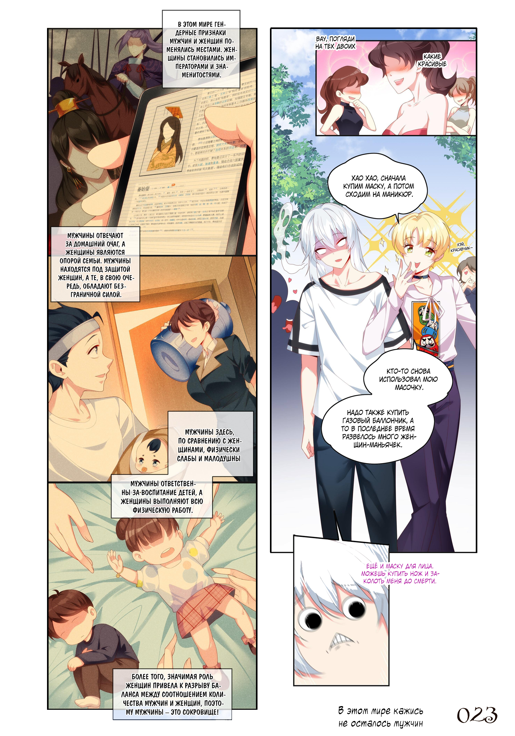 Маньхуа интересная, весёлая, где главный герой попадает в феминистский мир (мечта, прямо), где роль мужчины в современном мире выполняет женщина, а роль женщины — мужчина. Но не только роли, с физическими данными, к сожалению, тоже не особо повезло, чего нельзя сказать про внешность. С этим у главного героя проблем явно нет, ведь он очень красив, а все девушки вокруг по нему сохнут.