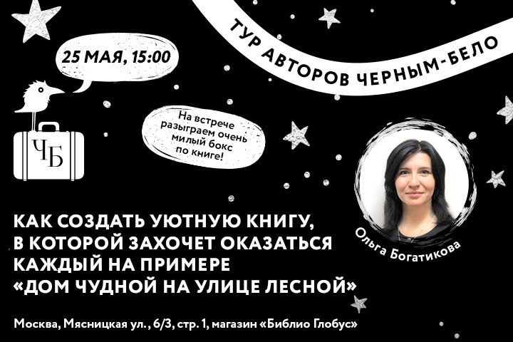 25 мая в Москве в магазине «Библио-Глобус» пройдет очередная встреча в рамках тура «Черным-бело». Она будет посвящена уютному фэнтези, героем которого захочется стать каждому. Перед читателями выступит Ольга Богатикова, автор романа «Дом чудной на улице Лесной». Добрая и искренняя книга напоминает, что волшебство окружает каждого из нас. Нужно лишь научиться видеть его в повседневных мелочах.