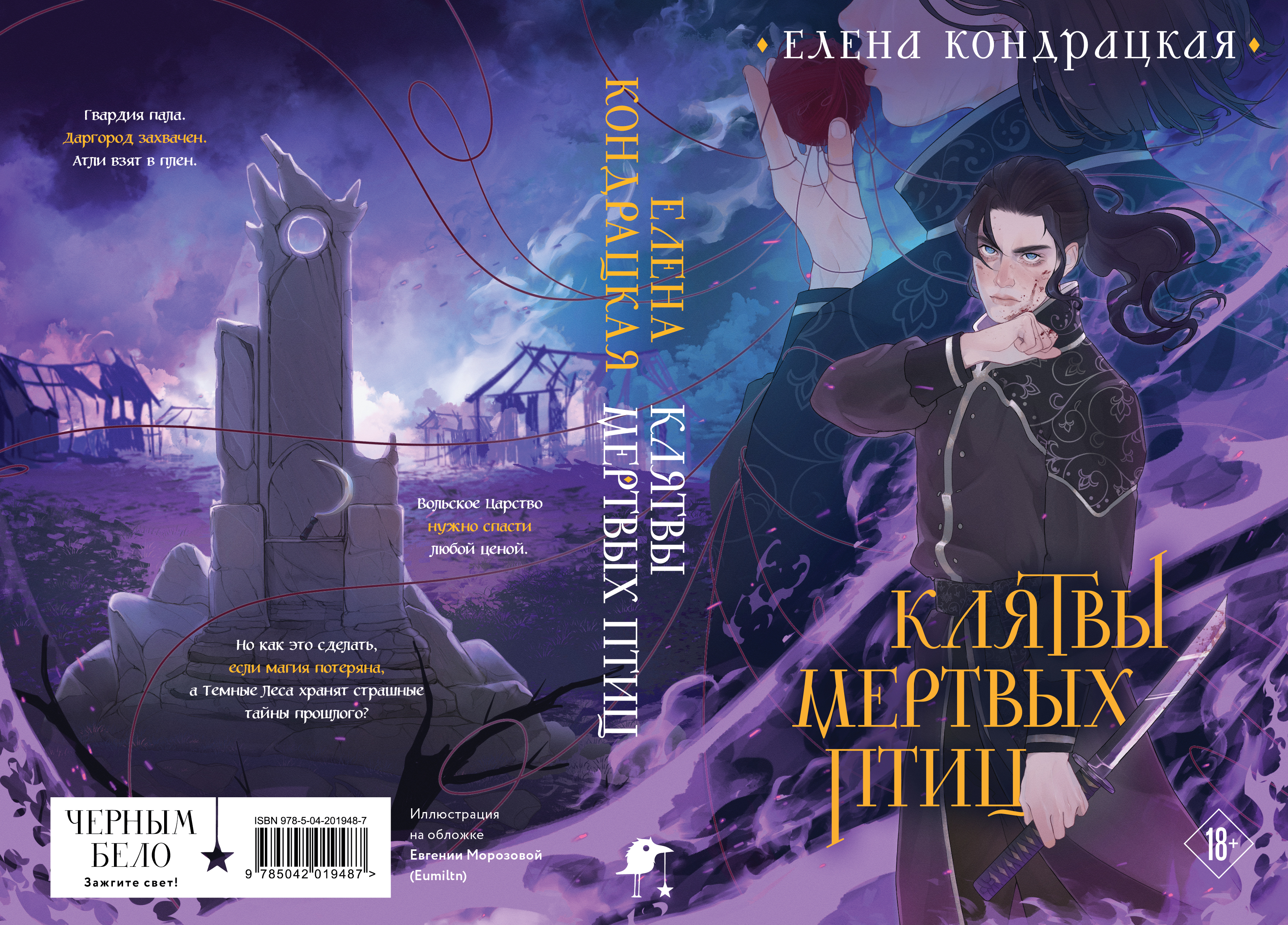 В августе в издательстве «Черным-бело» выйдет заключительная часть трилогии Елены Кондрацкой «Клятвы мертвых птиц». К завершению трилогии автор подготовила три бонусные главы. Издание оформила художница Евгения Морозова (eumiltn).