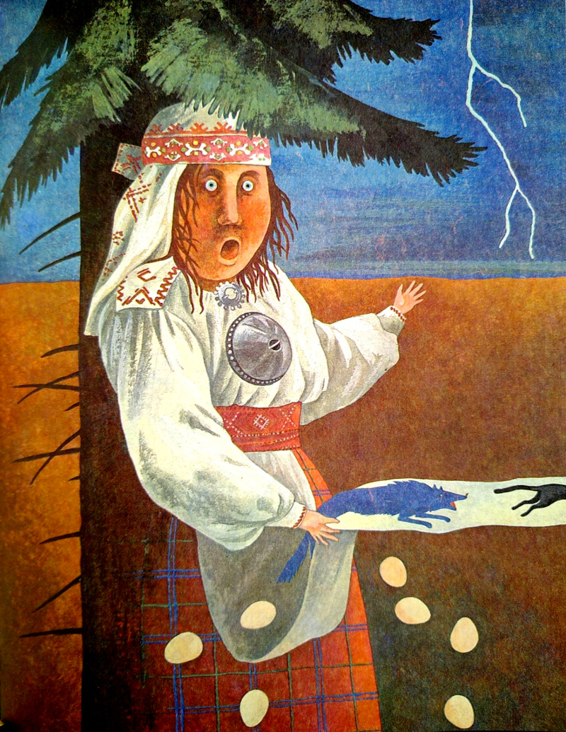 Боится бедняжка заглянуть в передник. Наконец подняла-таки глаза и видит: стоит перед нею неподвижно огромный волчище и во все глаза глядит на ее передник. Со страху у молодухи руки как отнялись, отпустила она подол. В тот же миг выскочила из передника черная кошка и ну бежать. А волк за ней во весь дух. Сколько-то времени слышно было еще, как волк бежит, а потом опять всё стихло. Ливень и гром прекратились, снова выглянула луна, словно и не бушевало только что всё вокруг. Подивилась тут молодуха, что одежда на ней ничуть не промокла и луж нигде не видать. И с дороги она сбилась — на целую версту в лес ушла. Подобрала молодуха яйца, сложила их поскорее в передник, отправилась своей дорогой. Рассказала она про тот случай матери. Старуха говорит: сам Нечистый решил поозоровать. А волк в таких случаях всегда на помощь приходит, потому как он терпеть не может Нечистого и его проказы.