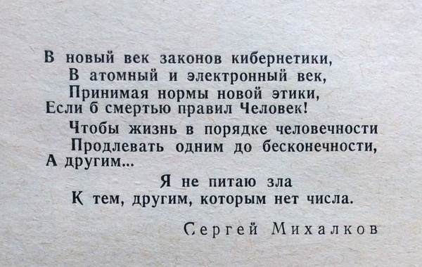 "В новый век законов кибернетики, В атомный и электронный век. Принимая нормы новой этики, Если б смертью правил человек! Чтобы жизнь в порядке человечности Продлевать одним до бесконечности, А другим... Я не питаю зла К тем другим, которым нет числа. Сергей Михалков".