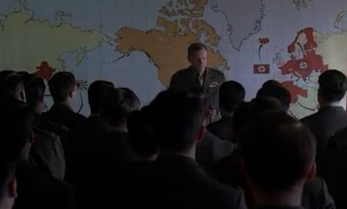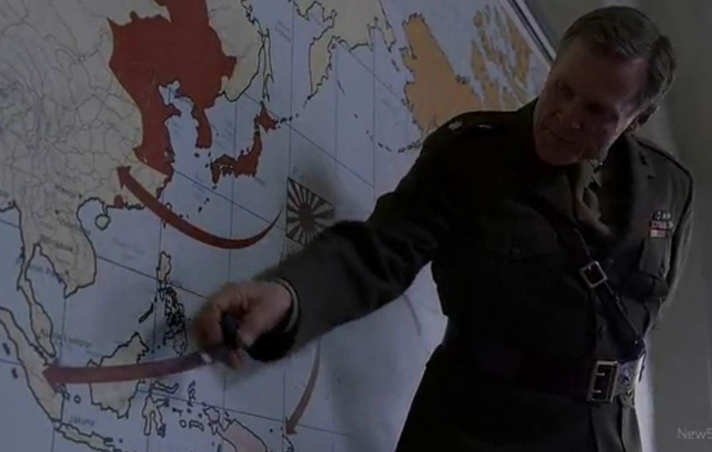 В общем и целом, сериал пришёлся мне весьма по вкусу. Вот только уже в самой первой серии в одной из сцен узрел я на стене карту мира с обстановкой по состоянию на начало 1942 года. Впечатлило. Мало того, что юг Сахалина на ней был неяпонский, но и объект нашего сегодняшнего разговора отчего-то оказался украшен солидных размеров нацистской свастикой.