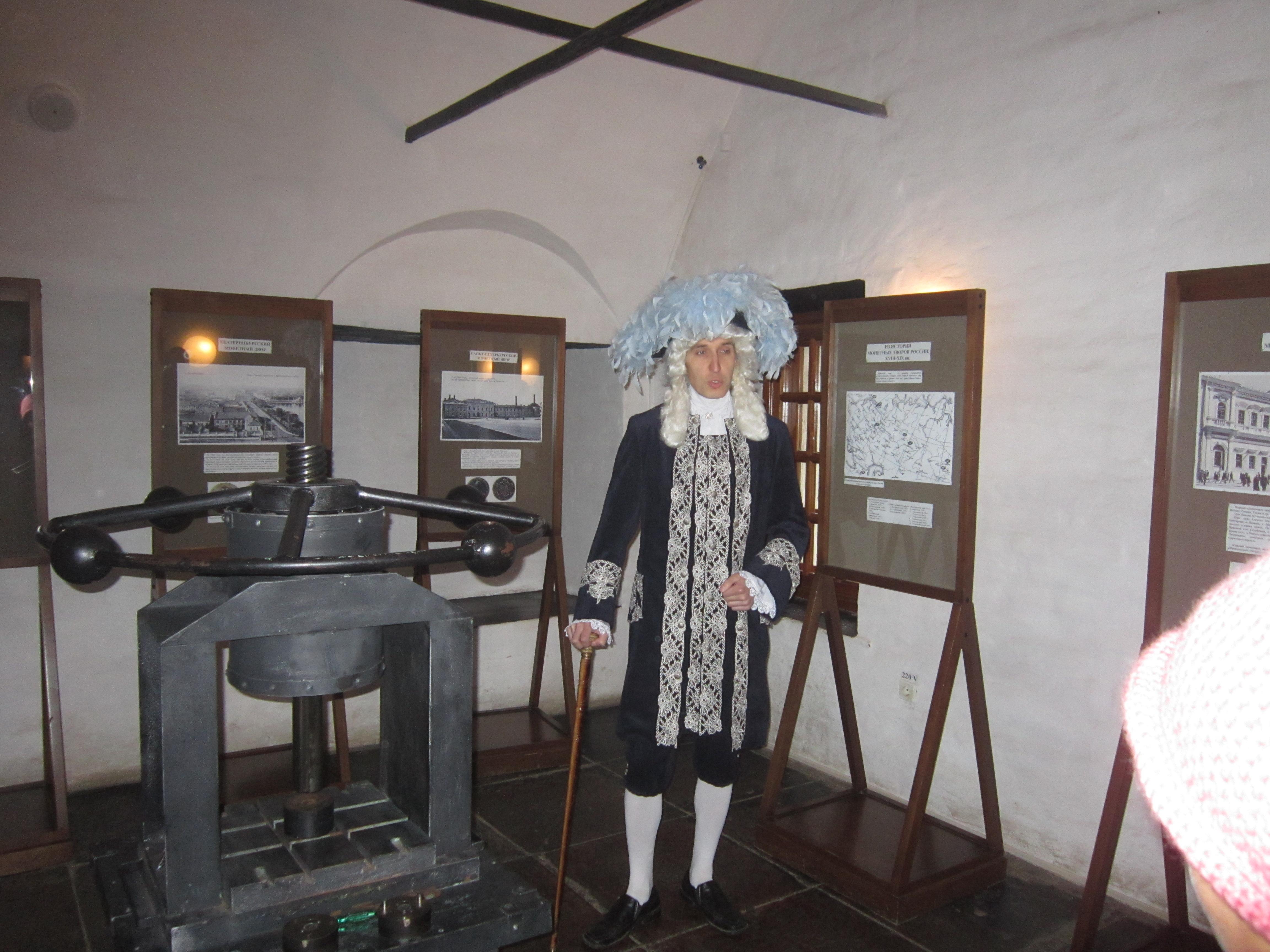 На первом этаже нас встретил сам Акинфий Демидов стоявший около пресса, на котором можно было изготовить демидовскую монету из медной заготовки.