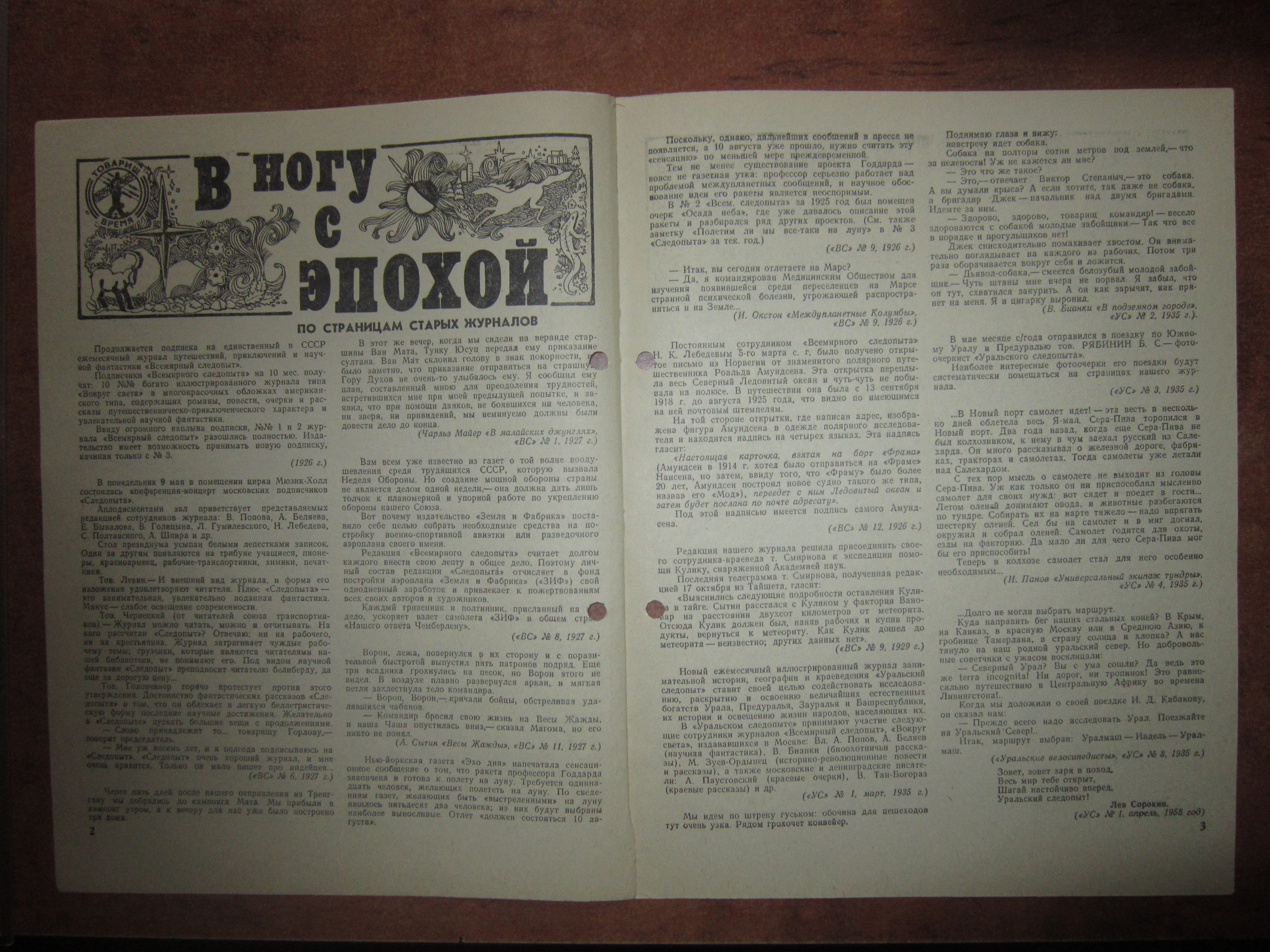 В двадцатых годах при НЭПе появилось довольно много литературно-развлекательных журналов. Один из них это "Всемирный Следопыт" организованный Владимиром Поповым. Выходил он недолго (1925-1931гг), но успел полюбиться читателями, на что указывает увеличение тиража. Затем В.Попов попытался в Свердловске организовать выпуск "Уральского Следопыта", но в 1935 году вышло только 9 номеров. После этого журнал закрыли. "Уральский Следопыт" снова возродился в Сведловске в апреле 1958года и выходит до сих пор. Про эти журналы есть довольно много различных материалов, как в прессе, так и интернете. Например: http://www.fandom.ru/about_fan/krutskih_1... Во времена Советского Союза к юбилеям "Уральского Следопыта" было выпущено три книги с материалами ранее публиковавшимися в журнале: "Следопыт" (СУки 1968г) , "Тропы "Уральского Следопыта" (М Г 1978г) и "Азимут "Уральского Следопыта" (СУки 1983г). В них размещалась и фантастика: в первом рассказ и повесть, во втором пять рассказов- в том числе рассказ А Беляева "Слепой полет" (1935г), в третьем фантастики не было. Кроме этого в Узбекистане также один раз выходила книга "Следопыт Средней Азии"(1964г), но без фантастических рассказов. (См. Файл) В 21 веке выходило два журнала "Наш Следопыт" и "Всемирный Следопыт", но без особого успеха, хотя фантастика в них печаталась. https://fantlab.ru/work410264 http://img-fotki.yandex.ru/get/3702/54678... http://fantlab.ru/edition46918