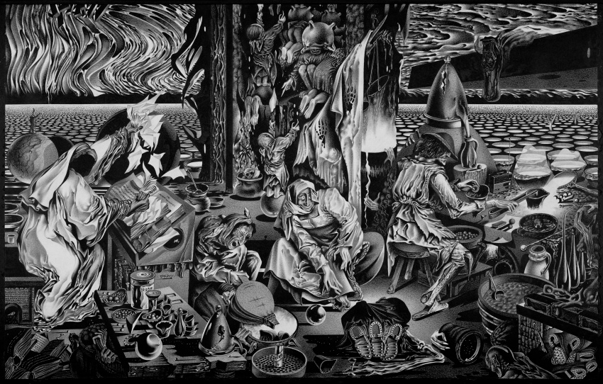 Понятно, что кота видим мы, зрители, а не персонажи. Это для нас реальность планеты трансформируется в эти образы. При том, что рисунки Фоменко – не только иллюстрации к «Мастеру...», но и одновременно графические выражения той или иной математической абстракции. То есть эшеровское воплощение на плоскости невоплотимого, что придает им оттенок инаковости.