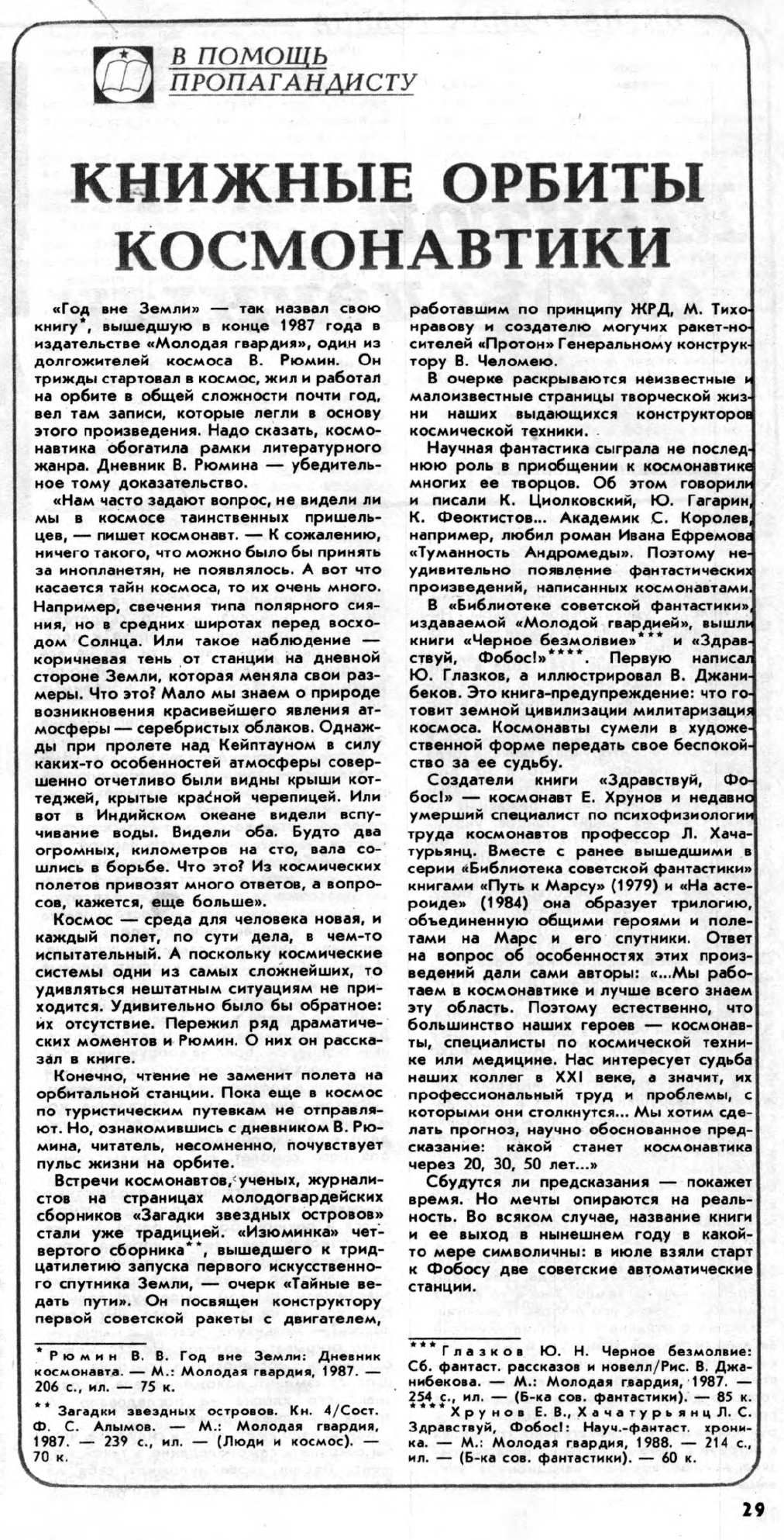 Книжные орбиты космонавтики (рецензия на книгу В. Рюмина «Год вне Земли», сборник «Загадки звёздных островов», сборник Ю. Глазкова «Чёрное безмолвие», книгу Е. Хрунова, Л. Хачатурьянца «Здравствуй, Фобос!») // Авиация и космонавтика № 8 1988, стр. 29