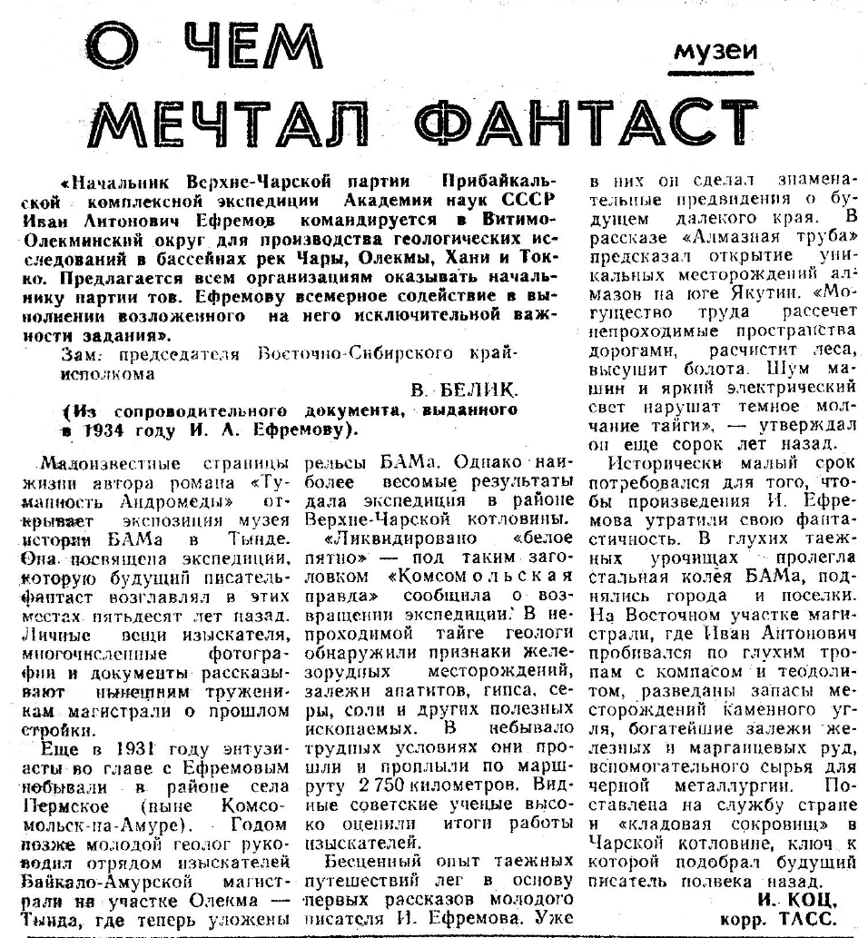 Коц, И. О чём мечтал фантаст : [Инф. корр. ТАСС, г. Тында, Амурская обл. о работе И. Ефремова на БАМе в 1934 г.] // Тихоокеанская звезда (Хабаровск). — 1984. — 8 июля.