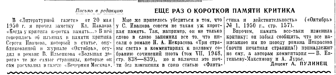 А. Пулинец. Ещё раз о короткой памяти критика (заметка) // Литературная газета № 54, 5 июля 1950, с. 3.