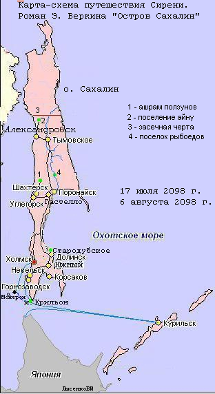 Роман Эдуарда Веркина «Остров Сахалин» направил в будущее сигнал о том, что в России есть писатели, учёные готовые принять ответ. Что ж, получите его. Передача островов Малой Курильской гряды с заключением секретного пакта приведёт к тому, что «в первый день Войны Россия прикрыла Японию, перехватив стартовавшие баллистические ракеты» с корейского полуострова. В дальнейшем развитии войны Япония уничтожает остатки российского населения, заражённого МОБ (мобильное бешенство).