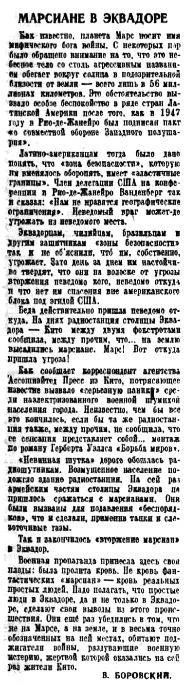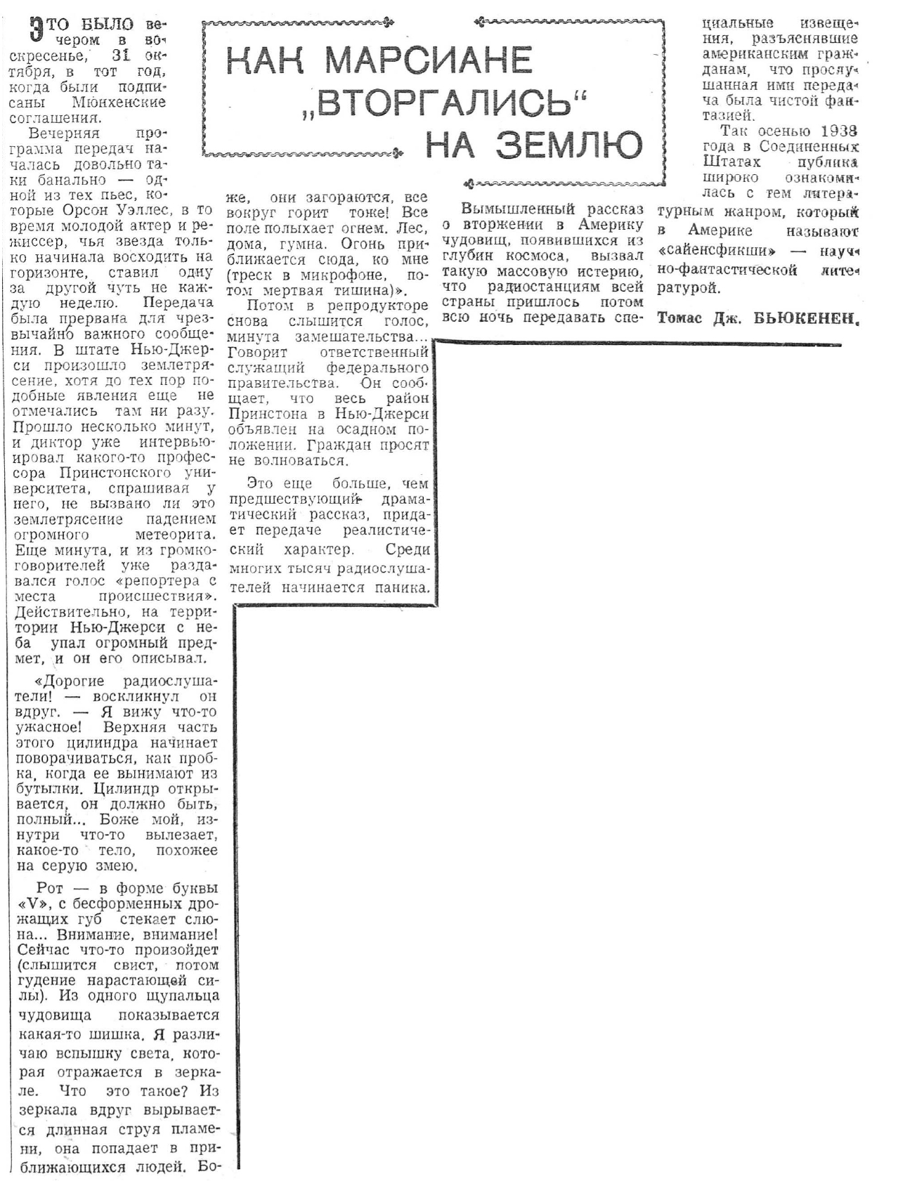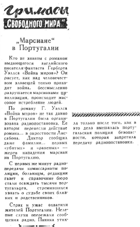 Недавно в Соединенных Штатах Америки произошло из ряда вон выходящее происшествие, весьма показательное для современного состояния умов широких слоев населения в капиталистическом мире: передача по радио известного литературного произведения вызвала беспримерную панику в целой стране. Сейчас, после того как в американских газетах и журналах улеглась дискуссия, вызванная этим поразительным происшествием, легко можно восстановить его со всеми подробностями.