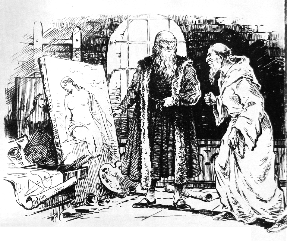 Когда папа вызвал Леонардо к себе, солдаты, охранявшие дворец, железными клещами поймали ползающее чудовище, вытащили его во двор, чтобы сжечь живьем. Окруженный монахами, предстал художник перед троном наместника бога.