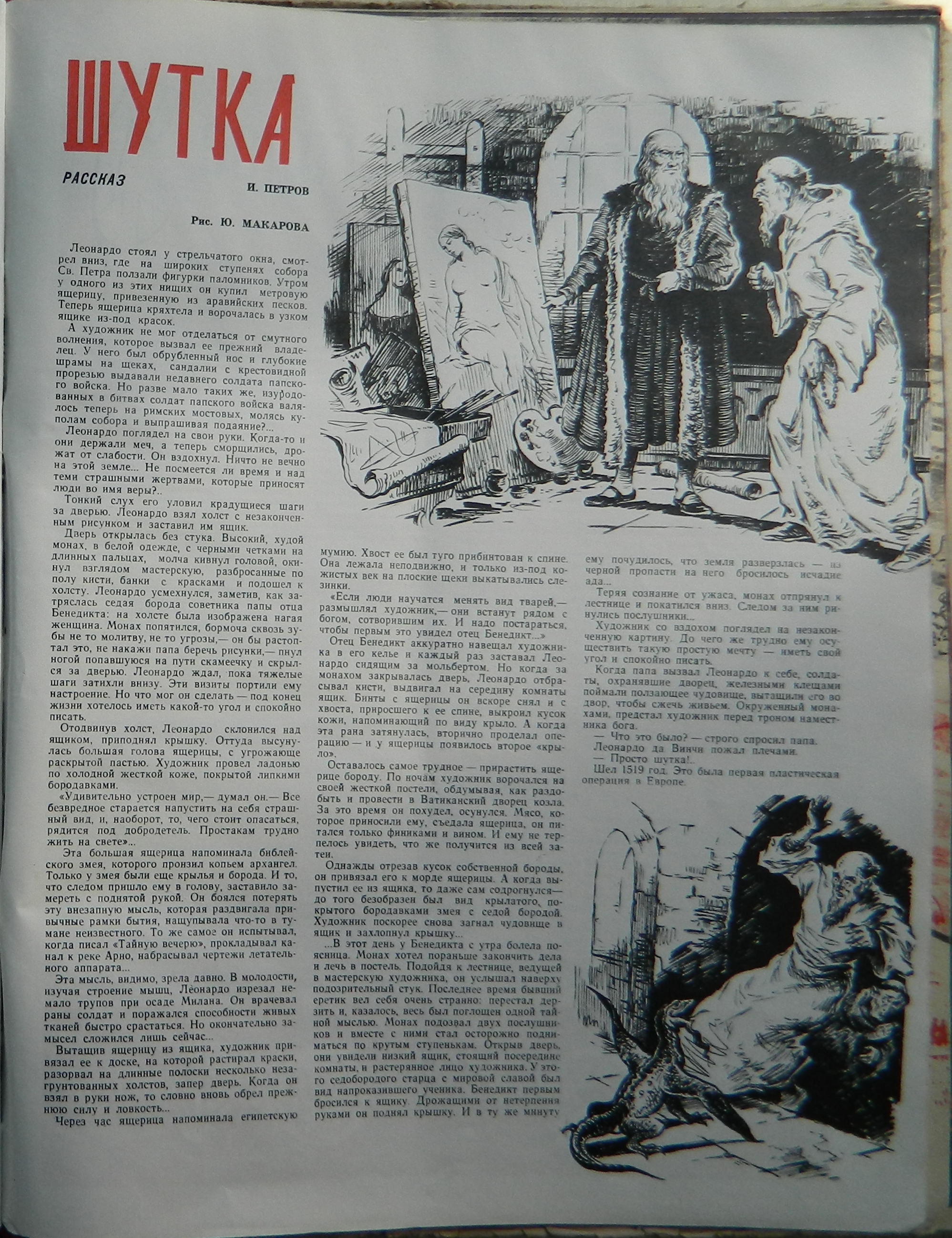 И. Петров. Шутка (рассказ, иллюстрации Ю. Макарова) // Знание-сила. — 1963. – ноябрь (№ 11). — С. 51