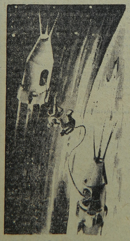 — Выход космонавта на поверхность корабля является не только рискованным «спортивным» экспериментом. Подобные маневры станут неоценимыми при встрече двух кораблей на орбите, при монтаже спутника-платформы, служащей для старта на другие планеты и для посещения человеком Луны.