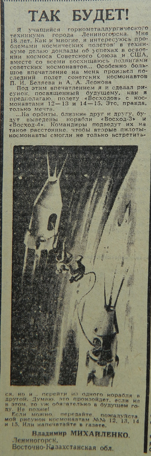 Я учащийся горнометаллургического техникума города Лениногорска. Мне 18 лет. Как и многие, я интересуюсь проблемами космических полетов: в техникуме делаю доклады об успехах в освоении космоса Советского Союза и США, вместе со всеми восхищаюсь подвигами советских космонавтов... Особенно большое впечатление на меня произвел последний полет советских космонавтов П. И. Беляева и А. А. Леонова.
