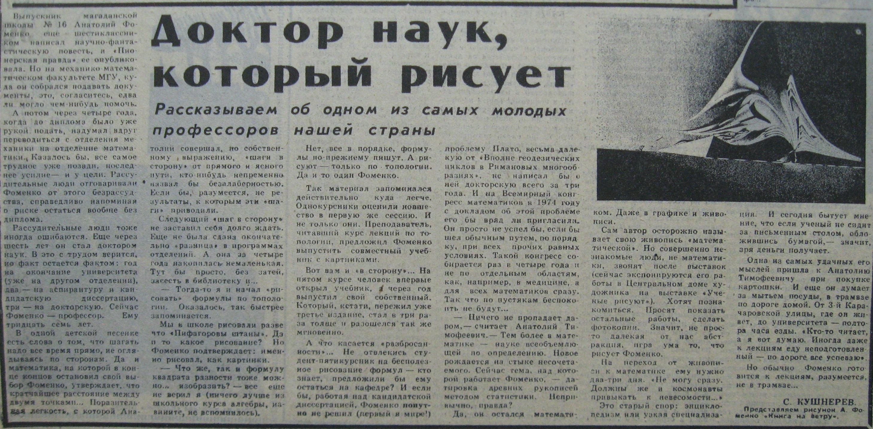 Выпускник магаданской школы № 16 Анатолий Фоменко ещё шестиклассником написал научно-фантастическую повесть, и «Пионерская правда» её опубликовала. Но на механико-математическом факультете МГУ, куда он собрался подавать документы, это, согласитесь, едва ли могло чем-нибудь помочь.