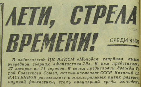 В издательстве ЦК ВЛКСМ «Молодая гвардия» вышел очередной сборник «Фантастика-79», В нём представлены 27 авторов из 11 городов. В своём, предисловии дважды Герой Советского Союза, лётчик-космонавт СССР Виталий Севастьянов размышляет о магистральных путях развития научной фантастики столь популярной среди молодежи.