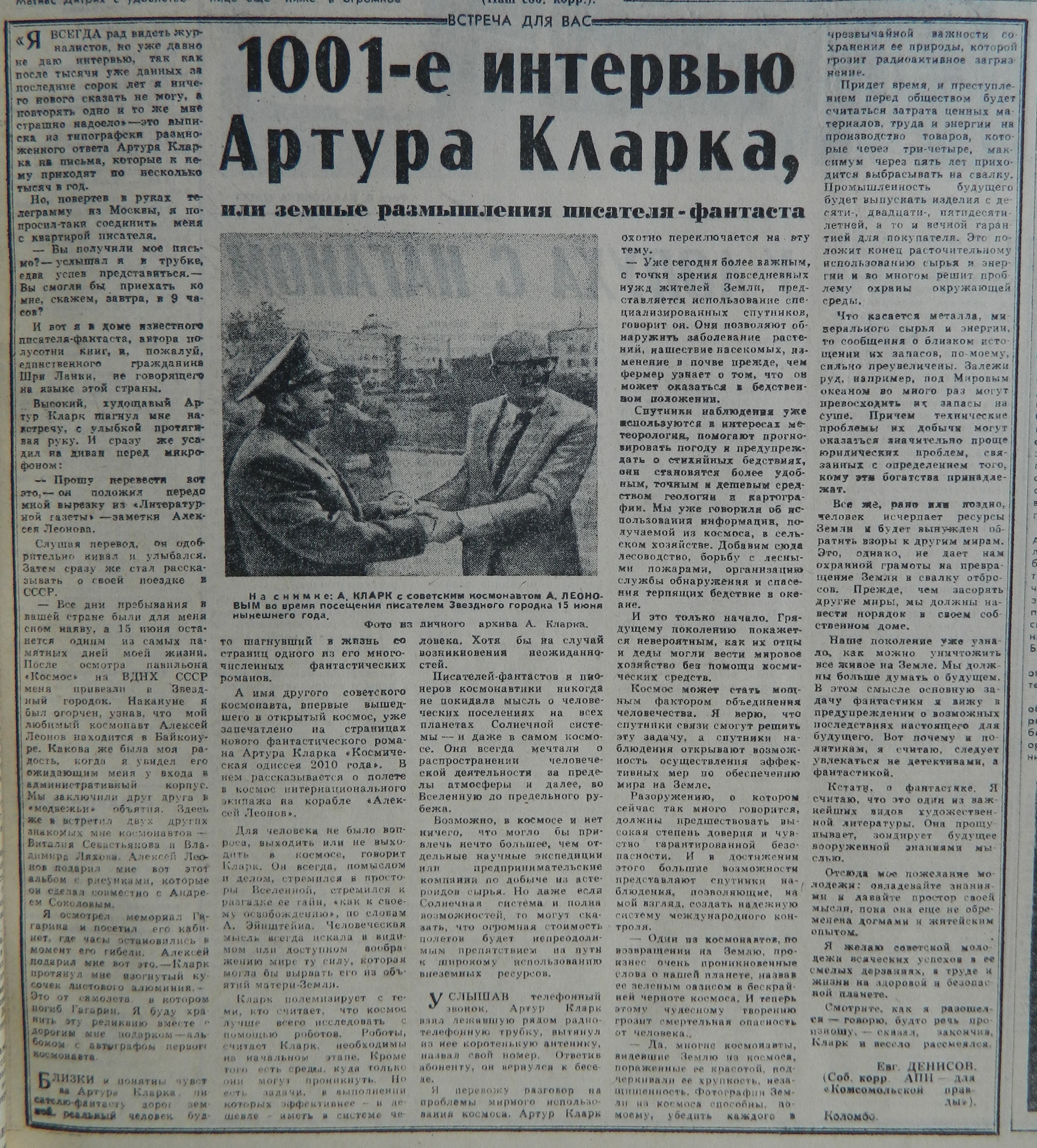 А имя другого советского космонавта, впервые вышедшего в открытый космос, уже запечатлено на страницах нового фантастического романа Артура Кларка «Космическая одиссея 2010 года». В нем рассказывается о полете в космос интернационального экипажа на корабле «Алексей Леонов».