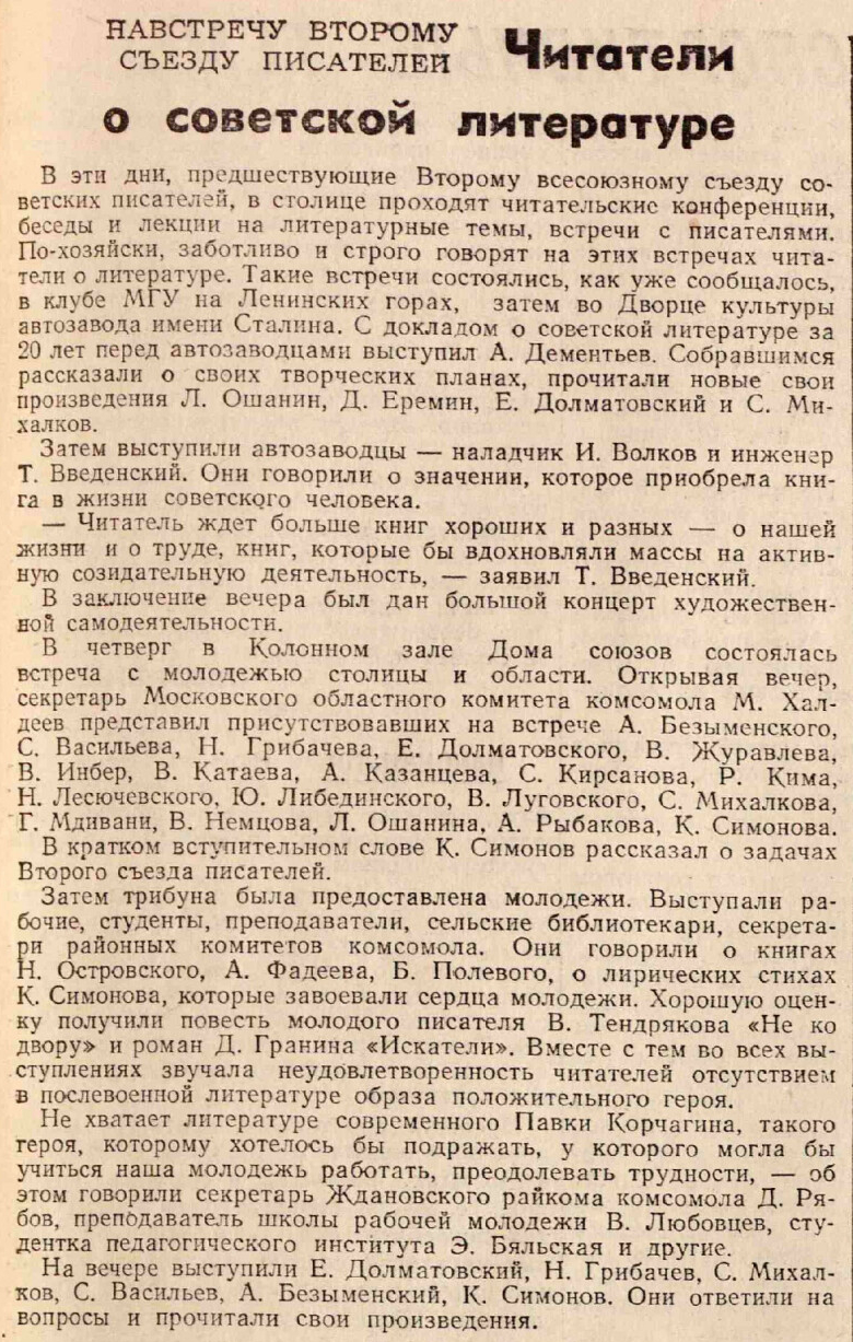 В эти дни, предшествующие Второму всесоюзному съезду советских писателей, в столице проходят читательские конференции, беседы и лекции на литературные темы, встречи с писателями. По-хозяйски, заботливо и строго говорят на этих встречах читатели о литературе. Такие встречи состоялись, как уже сообщалось, в клубе МГУ на Ленинских горах, затем во Дворце культуры автозавода имени Сталина. С докладом о советской литературе за 20 лет перед автозаводцами выступил А. Дементьев. Собравшимся рассказали о своих творческих планах, прочитали новые свои произведения Л. Ошанин, Д. Еремин, Е. Долматовский и С. Михалков.