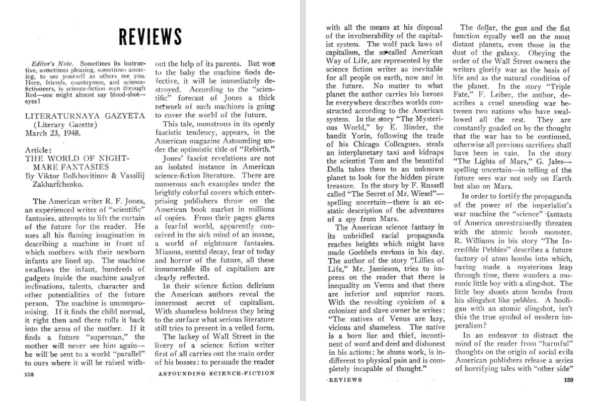 Editor`s Note. Sometimes its instructive, sometimes pleasing, sometimes amusing, to see youself as others see you. Here, friends, countrymen, and science-fictioneers, is science-fiction seen throught Red — one might almost say blood-shot — eyes !