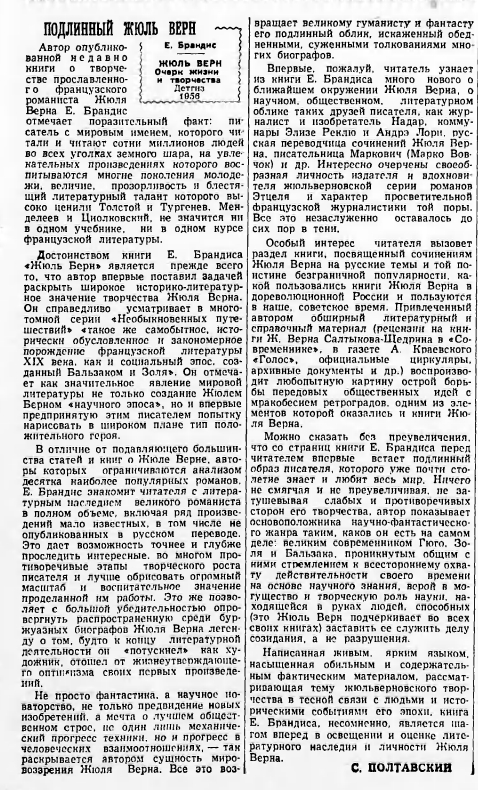 Можно сказать без преувеличения, что со страниц книги Е. Брандиса перед читателем впервые встает подлинный образ писателя, которого уже почти столетие знает и любит весь мир. Ничего но смягчая и не преувеличивая, не затушевывая слабых и противоречивых сторон его творчества, автор показывает основоположника научно-фантастического жанра таким, каков он есть на самом деле: великим современником Гюго, Золя и Бальзака, проникнутым общим с ними стремлением к всестороннему охвату действительности своего времени на основе научного знания, верой в могущество и творческую роль науки, находящейся в руках людей, способных (это Жюль Верн подчеркивает во всех своих книгах) заставить ее служить делу созидания, а не разрушения.