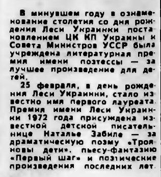 В минувшем году в ознаменование столетия со дня рождения Леси Украинки постановлением ЦК КП Украины и Совета Министров УССР была учреждена литературная премия имени поэтессы — за лучшее произведение для детей.