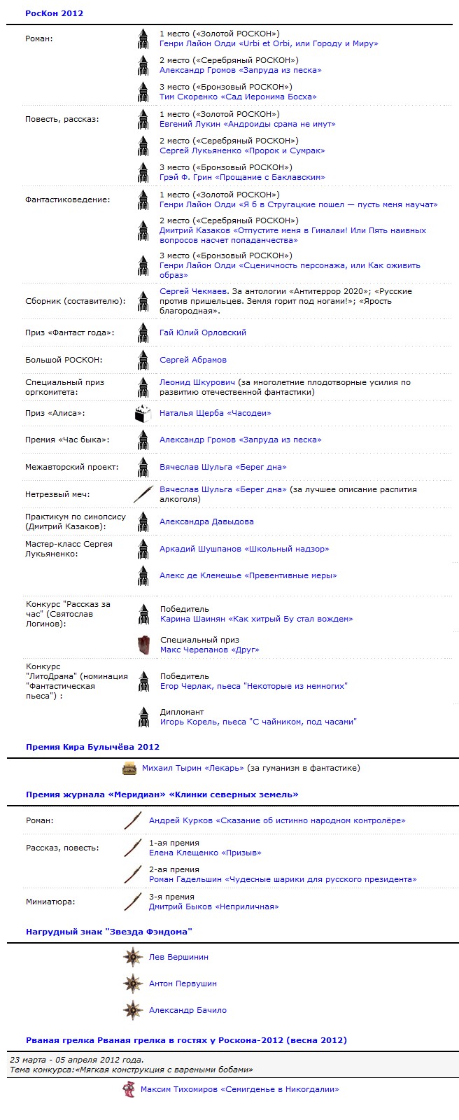 Захотелось вот порадовать вас друзья, более полной версией номинационного списка РосКона 2012. Мне кажется для всех нас, кто въедливо вчитывается в библиографии писателей и другие дополнительные и справочные материалы, было бы тоже интересно, какие премии вручались помимо основных. Где-то они не серьёзны, где-то забавны. Но факт остаётся фактом.