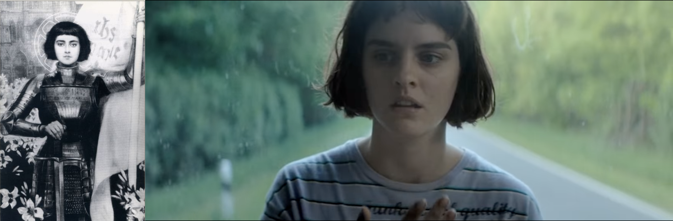 Еще одна интересная параллель, которая сразу приходит в голову. Это, конечно, Жанна Д'Арк. Джамбо — французский фильм, где главную героиню зовут Жанна и выглядит она точь в точь как Жанна Д'Арк. Так что мы точно видим фильм про девушку, вариацию Жанны Д'Арк, которая слышала голоса из потустороннего, а не про сумасшедшую аутистку.