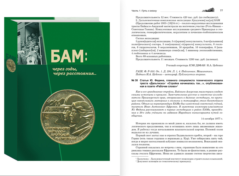 Начну с того, что в прошлом — 2014 году — отметили 40-летие БАМа. Готовились много и по разному. Государственный архив Хабаровского края подарил бамовцам книгу: «БАМ: через годы, через расстояния…». Сборник архивных документов из истории строительства Восточного участка Байкало-Амурской магистрали. – Хабаровск: издательский дом «Частная коллекция», 2014. – 586 с. [32 (цв. вкл.)], с ил.