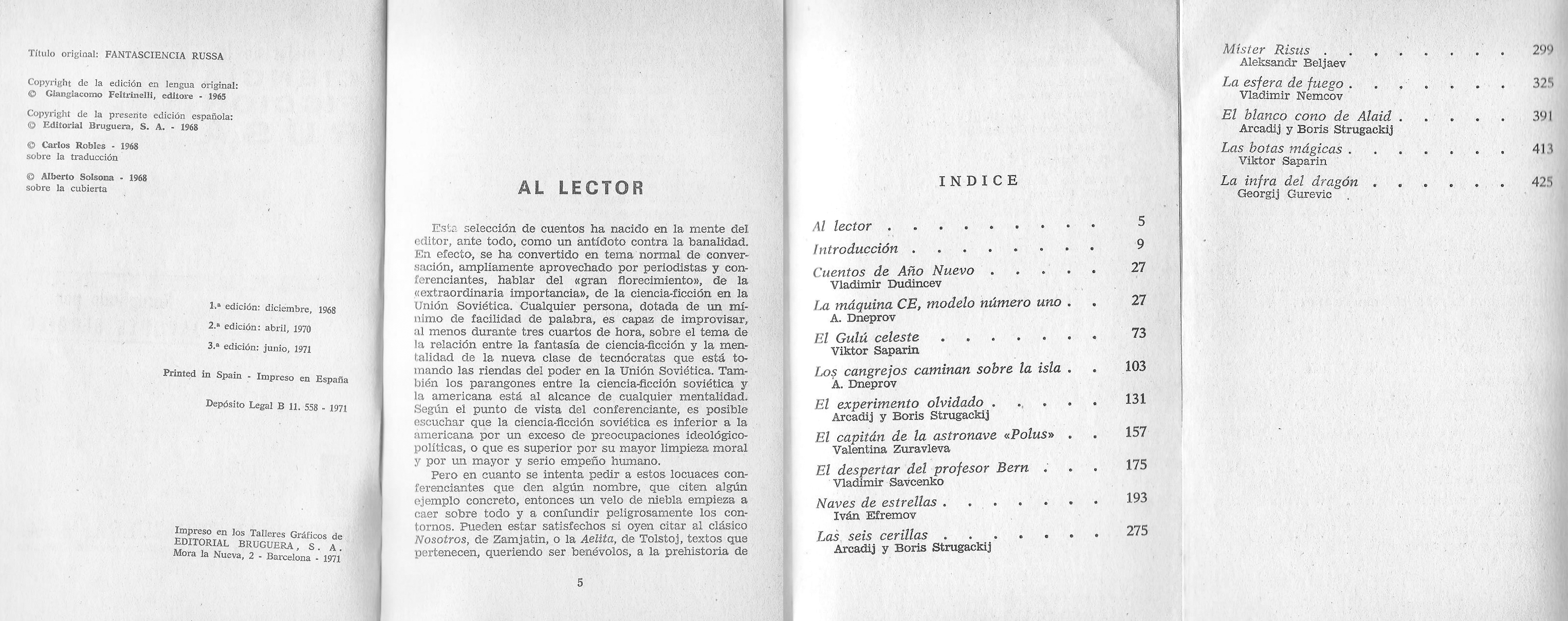 На ФЛ есть, вроде бы, такое издание: https://fantlab.ru/edition74166 Но, не спешите! Я показываю издание 1971 года! То есть — прижизненное издание перевода повести на испанский! Внешнее отличие: левом верхнем углу обложки красная полоска: "Antologias". На Фантлабовском её нет. И ещё, на обороте титула перечислены: 1-е издание (1968); 2-е издание (1970); 3-е издание (1971).