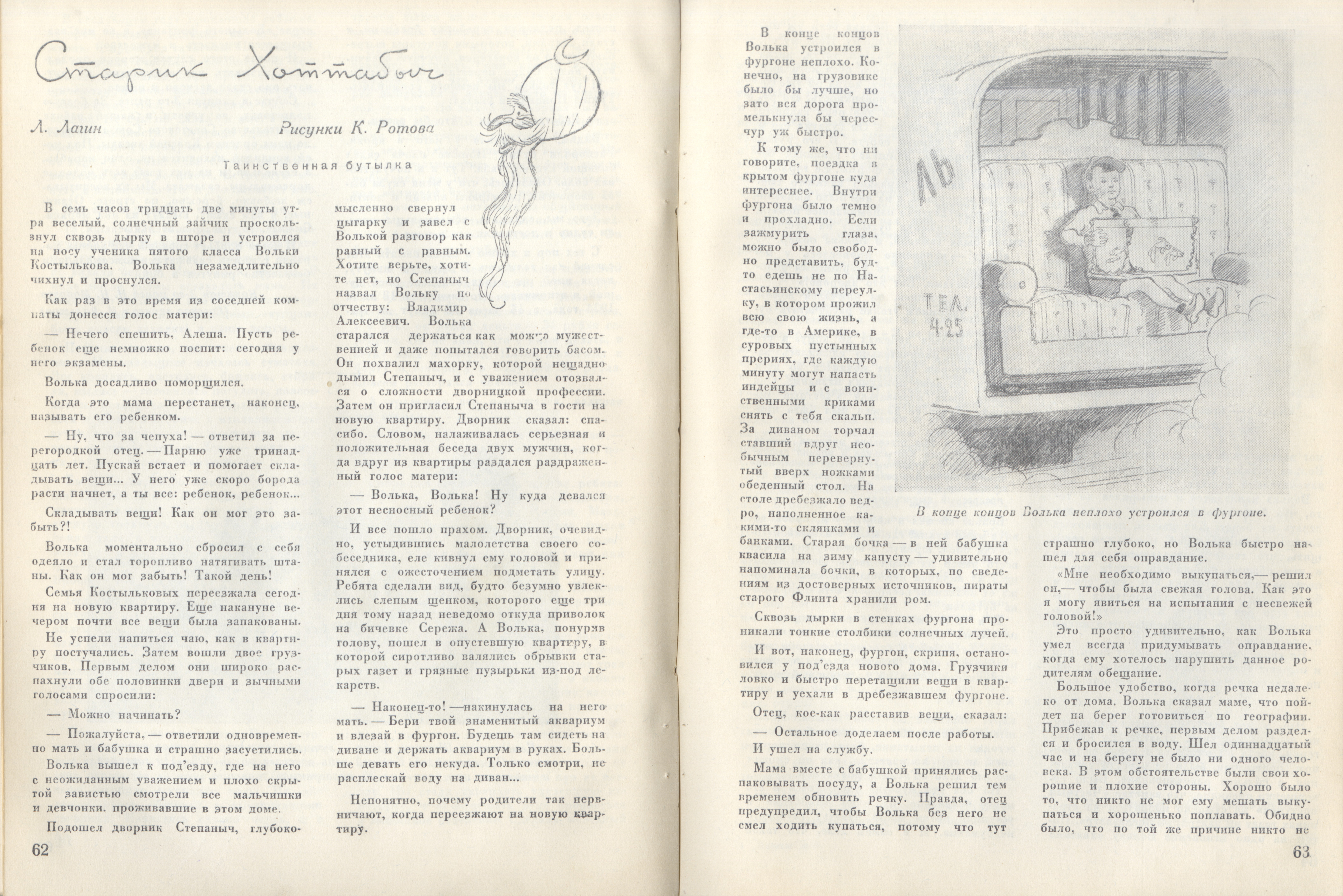 — Ну, что за . чепуха! — ответил за перегородкой отец* — Парню уже тринадцать лет. Пускай встает и помогает складывать вещи... У него уже скоро борода ра-сти начнет, а ты все: ребенок, ребенок... Складывать вещи! Как он мог это забыть?! Волька • моментально, сбросил с себя одеяло/и стал торопливо иатагирать штаны; Как он мог забыть! Такой день! Семья Костыльковых переезжала сегодня, на новую квартиру. Еще накануне вечерея почти все веши были запакованы. Не успели напиться чаю. как в квартиру постучались. Двое грузчиков ргароао распахнули обе половники двери и зычными голоегши спросили: '' . ~ У. Можно начинать? — Пожалуйста, — ответили одновременно мать и бабушка и страшно засуетились. Волька торжественно вынес на улицу к фургону диванные валики и спинку. — Переезжаете? — опросил у него Сережа Кружкия, веселый паренек с черными хитрыми глазами. — Переезжаем, — сухо ответил Волька с таким видом, как будто он переезжал с кваршры на квартиру каждую шестидневку и будто в этом не было для него ничего удивительного. Подошел дворник Степаныч, глубокомысленно свернул цыгарку я неожиданно завел с Волькой солидный разговор, как равный с равным. У мальчика от гордости и счастья слегка закружилась голова. Он с уважением отозвался о сложности дворницкой профессии, потом набрался духу и пригласил Стеланыча в гости на но-бую квартиру. Дворник сказал мерси. Словом. налаживалась серьезная я положительная беседа двух мужчин, когда вдруг из квартиры раздался раздраженный голос матеря: — Волыса, Волька! Ну куда девался этот несносный ребенок? х И все разом пошло прахом. Дворник, очевидно, устыдившись малолетства своего собеседника, еле кивнул ему головой и принялся с ожесточением подлетать улицу. Ребята сделали вид, будто безумно увлеклись слепым щенком, которого еще три дня геведомо откуда приволок на бечевке Сережа. А Волька. понурив голову, пошел в опустешутэ квартиру, в которой сиротливо валялись обрывюи старых газет и грязные пузырьки из-под лекарств. — Наконец-то! — накинулась на него мать. — Бери твой знаменитый аквариум и срочно влезай в фургон. Будешь там сидеть на диване и держать аквариум в руках. Болыпе девать его некуда. Только смотри, не расплескай воду на диван... 2. ТАИНСТВЕННАЯ БУТЫЛКА Наконец, фургон, скрипя, остановился ? подъезда их нового дома. Грузчики ловко я быстро перетащили вещи в квартиру и уехали в бодро дребезжавшем фургоне. Отец, кое-как расставив вещи, сказал: — Остальное доделаем после работы. И ушел на завод. Мша совместно с бабушкой принялись распаковывать посуду, а Волька решил тем временем обновить речку. Правда, отец предупредил, чтобы Волька без него не смел ходить купаться, потому что тут етралкно глубоко,, но Волыса быстро нашел для себя оправдание. /V — Мне необходимо выкупаться, — решил он, — чтобы была свежая голова. Как это я могу явиться — на испытания с несвежей головой? Это большое удобство, когда речка недалеко от дома. Волька сказал ламе, что пойдет нЯГберег готовиться по географии. Прибежав к речке, он первым делом раз. делся и бросился в воду. Шел одиннадцатый чаю, и на берегу не было ни одного человека. В этом обстоятельстве были свои. хорошие и плохие — стороны. Хорошо было то, что никто не мог ему помешать выкупаться и хорошо поплавать. Обидно было, что по той же причине никто не мог восторгаться тем, как красиво и