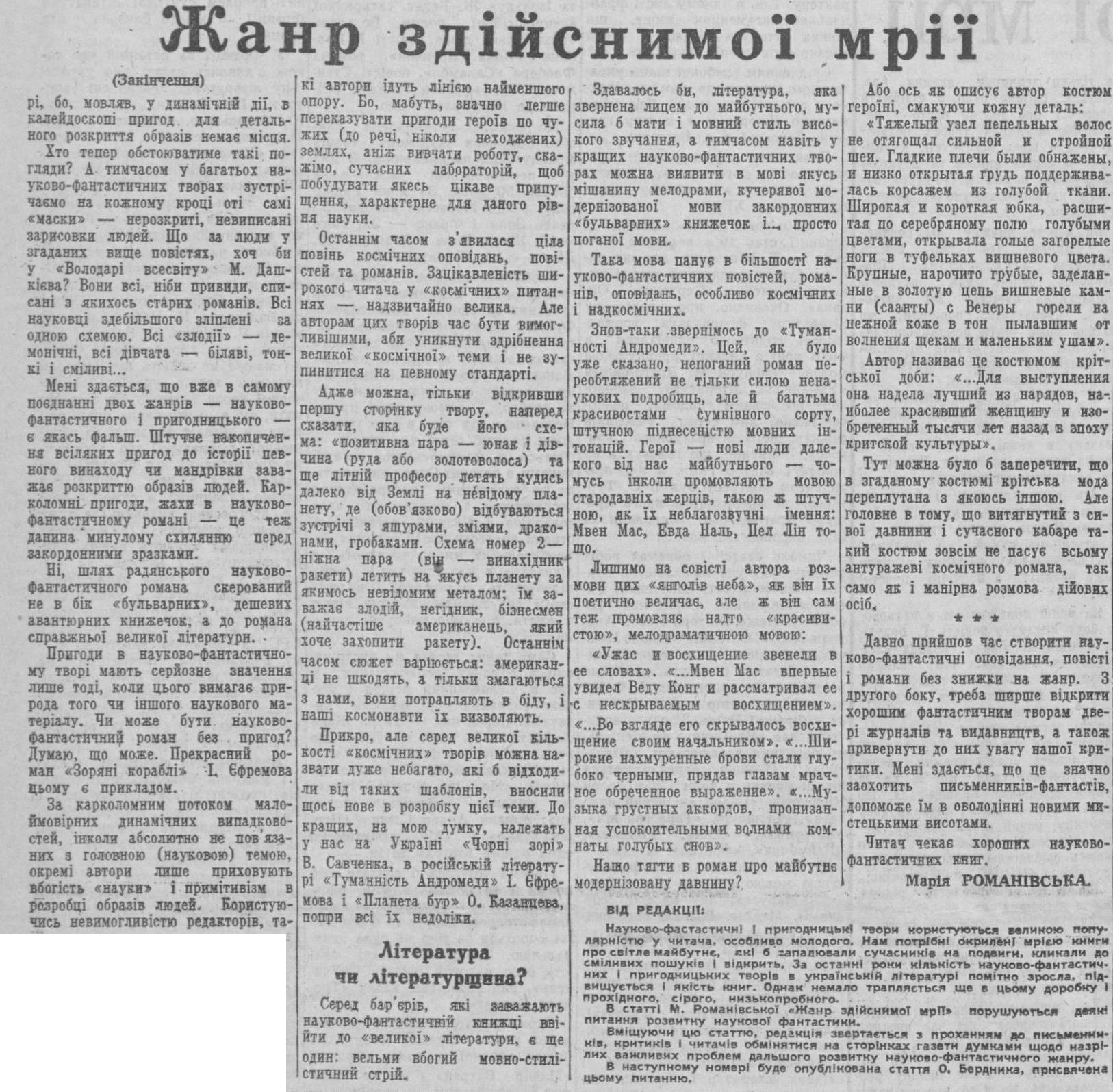 В 1960 году на страницах киевской «Литературной газеты» развернулась довольно продолжительная дискуссия об украинской фантастике, начало которой положила статья Марии Романовской «Жанр здійснимої мрії» («Жанр осуществимой мечты») в номере от 29 марта. В этой дискуссии с очень полемической статьёй поучаствовал и Владимир Савченко (полный текст этой статьи я выкладывал ранее). В более полном виде материалы дискуссии не так давно представил в своей колонке коллега slovar06. А здесь я привожу в переводе на русский язык фрагменты статьи М. Романовской с её мнением о повести В. Савченко.