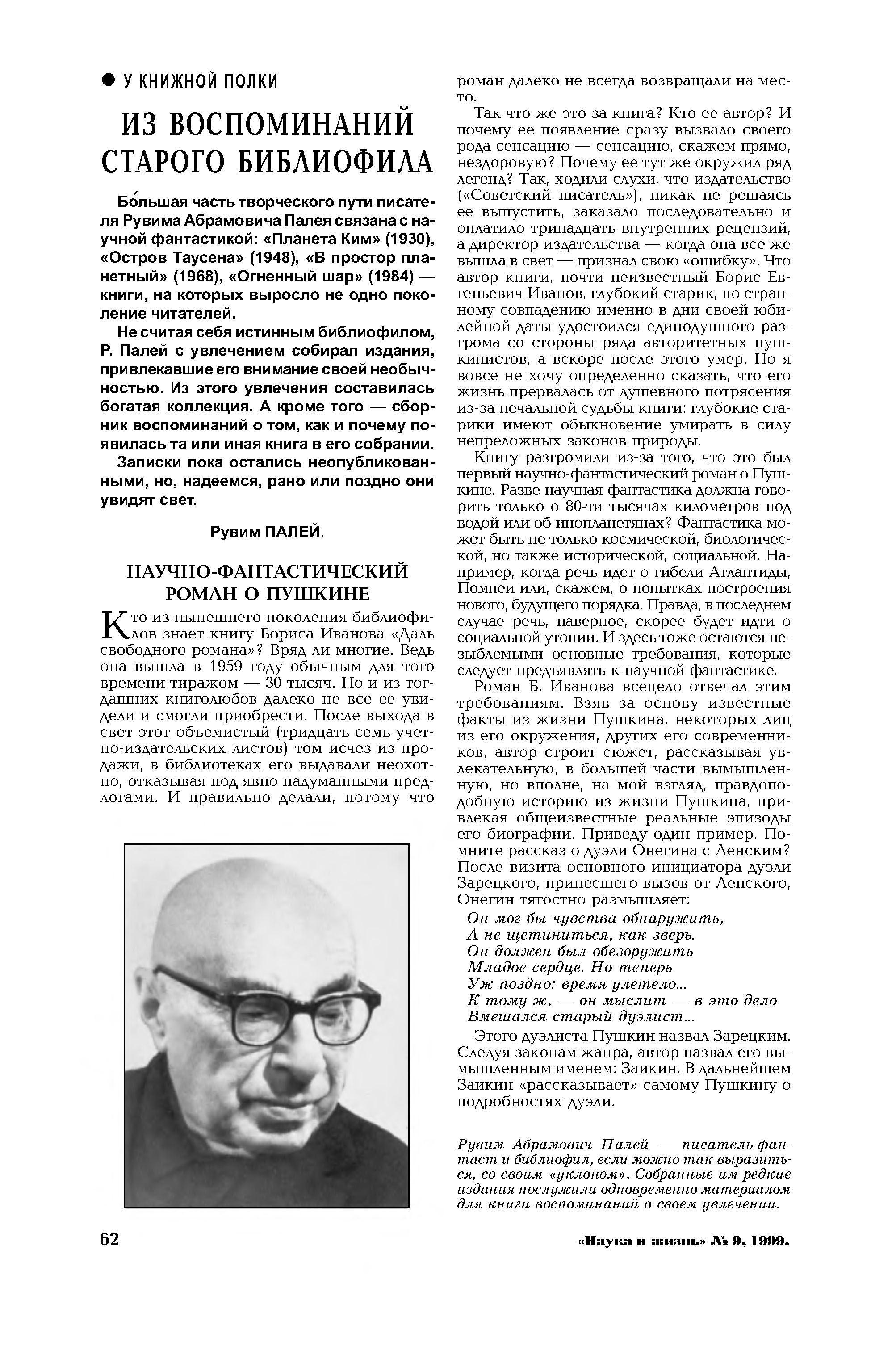 Книгу разгромили из-за того, что это был первый научно-фантастический роман о Пушкине. Разве научная фантастика должна говорить только о 80-ти тысячах километров под водой или об инопланетянах? Фантастика может быть не только космической, биологической, но также исторической, социальной. Например, когда речь идет о гибели Атлантиды, Помпеи или, скажем, о попытках построения нового, будущего порядка. Правда, в последнем случае речь, наверное, скорее будет идти о социальной утопии. И здесь тоже остаются незыблемыми основные требования, которые следует предъявлять к научной фантастике. Роман Б. Иванова всецело отвечал этим требованиям. Взяв за основу известные факты из жизни Пушкина, некоторых лиц из его окружения, других его современников, автор строит сюжет, рассказывая увлекательную, в большей части вымышленную, но вполне, на мой взгляд, правдоподобную историю из жизни Пушкина, привлекая общеизвестные реальные эпизоды его биографии. Приведу один пример. Помните рассказ о дуэли Онегина с Ленским? После визита основного инициатора дуэли Зарецкого, принесшего вызов от Ленского, Онегин тягостно размышляет: