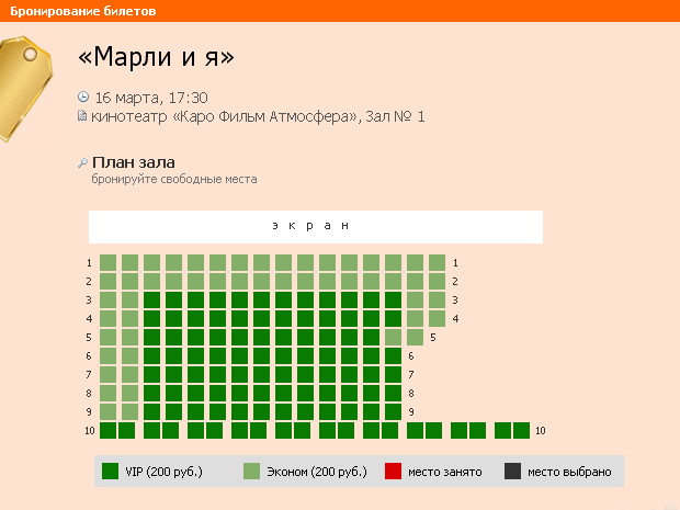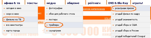 5. На сайте есть раздел "Афиша / Кинотеатры", где располагаются расписание практически всех сеансов по фильмам. Но нам не обязательно копаться в таком большом списке и тратить время. Переходим в папку "Смотреть в кино". Кликаем оттуда по любому фильму и переходим в графу "Сеансы", которая располагается в строке, где берут начало опции "Сайты, трейлеры, сеансы...". Если фильм ещё не вышел в прокат в вашем городе, то опция "Сеансы" конечно будет недоступной. Но в будущем вам обязательно может пригодится данный раздел сеансов по какому-то конкретному фильму. Во-первых, там указаны практически все сеансы с самых разных кинотеатров в вашем городе. Во-вторых, некоторые сеансы вы можете легко бронировать онлайн (к сожалению на данный момент только сети "Каро"). Удобство в том, что нет никакой дополнительной платы за бронь, а удобные места вы можете выбрать не вставая с дивана. Единственное что от вас требуется — это выкупить билет за 30 минут до начала сеанса, но даже если вы этого не сделаете, то ничего не прозойдёт, вы не останетесь должны. Подобное удобно, когда идёшь в выходной или праздничные день, чтобы получить лучшие места заранее.