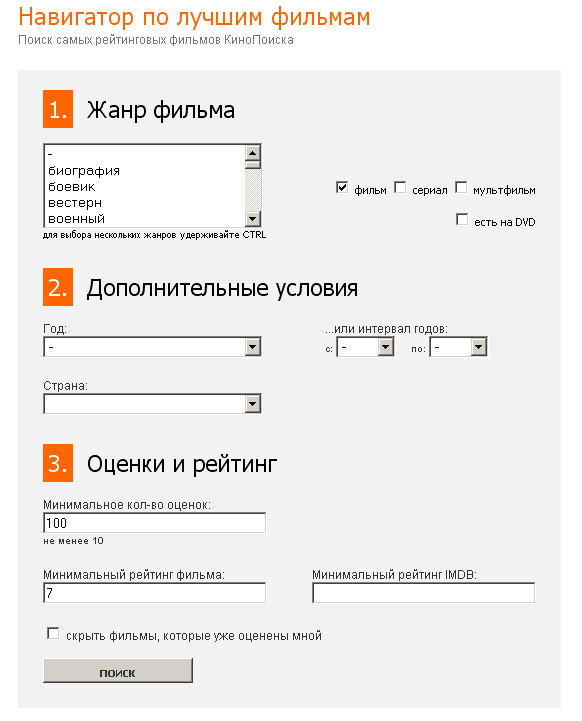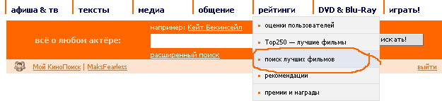 4. Ещё одна полезная и нужная опция — "Поиск лучших фильмов", другое название "Навигатор по лучшим фильм". С помощью него вы без трудна сможете отыскать лучшие фильмы не только по рейтингу КП, но по рейтингу IMDB. (К примеру на фантлабе в одном из разделов форума часто возникали вопросы — "Какие лучшие фильмы в этом жанре есть ещё?". Так вот сей раздел специально можно сказать для вас. Сможете найти лучшие фильмы в любом жанре).