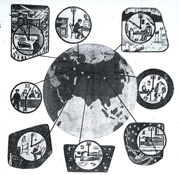— Ну, а с тобой что случилось? – спросил я Пита, летавшего в восточном направлении. — Со мной, — ответил Питт, — случилось, пожалуй, еще более необычайное. Если Алиев отказался принять твое поздравление потому, что, по его мнению, остались еще целые сутки до встречи нового года, то я готов биться об заклад… — Не бейся об заклад! – упрямо повторял я. — Я все-таки готов биться об заклад, что сегодня уже… — он посмотрел на часы — было 15 минут первого, — что сейчас уже 2 января 1954. Я почувствовал, что у меня голова начинает пухнуть от этих встреч нового года. — Вы меня с ума сведете! – воскликнул я. – Как это 2 января? — Да вот как. За двадцать четыре часа я прожил двое суток. Слыхал ли ты о чем-нибудь подобном? Этак я вдвое быстрее состарюсь, если всегда буду летать в восточном направлении. «В продолжение одних суток я дважды видел восход и заход солнца. Каждый этот день и каждая ночь длились – по моим часам – всего по шести часов. Да, я пережил за одни сутки двое «укороченных» суток. И сейчас для меня 16 минут третьих суток – 2-го января». — Вот так история! – воскликнул я, пытаясь разобраться во всем этом. И в тот же момент я услышал голос Глебова, — он, злодей, не забыл о пари. — Алло! Что же ты не поздравил меня с новым годом? Проиграл пари!.. – Глебов засмеялся. – Ты проиграл бы его, милый друг, даже в том случае, если бы поручился, что поздравишь ровно в полночь товарища, живущего на другом конце Ленинграда, потому что в таких больших городах, как Москва и Ленинград, в восточной части города новый год наступает по крайней мере на полминуты раньше, чем в западной. — Стоит ли спорить о полминутах и даже часах, когда вот тут у меня сейчас Алиев и Питт спорят о том, какая сегодня ночь – с 30-го на 31-е декабря прошлого года или с 1-го на 2-е нового года? Тут, братец ты мой, разница в несколько суток. — На этом меня не проведешь, — отвечал Глебов. – Алиев летел на запад со скоростью вращения земли, — в направлении, обратном этому вращению. Ясно, что для него звезды как бы неподвижно стояли над стратопланом и «время не двигалось». Питт же летел на восток. И его стратоплан, получив при отлете поступательную скорость самой земли при ее движении вокруг оси, прибавил такую же скорость, развиваемую самим стратопланом, в том же восточном направлении. Ясно, что для него в одни сутки должны были протечь двое, как в том случае, если бы земля начала вертеться вдвое быстрее. А пари ты все-таки проиграл. Попрыгаю я теперь на твоем шарике! Александр Беляев, "Еж", 1933 № 12, с. 6-9