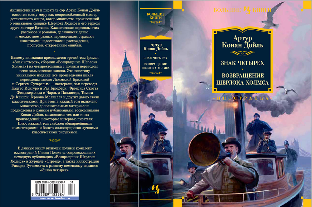 Вот и пришло время переиздания полного цикла произведений Артура Конан Дойля о приключениях Шерлока Холмса и доктора Ватсона, ранее выходившего в серии "Мир приключений". Даже не просто выходившего, а еще и не законченного — четвертый, последний том, выйдет в июне этого года. Но тираж первого тома уже почти распродан, его пора перевыпустить, и было решено сделать это не в серии "Мир приключений", а в "Иностранная литература. Большие книги", где ранее уже вышли три тома произведений этого писателя.