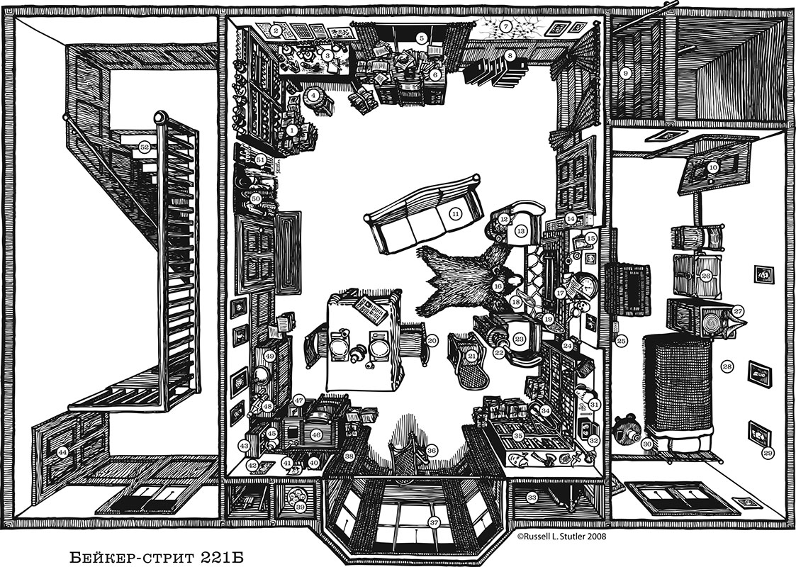 И это еще не все! На первом форзаце книги вы найдете красивую схему квартиры, которую для вас нарисовал Рассел Статлер, американский художник, ныне проживающий в Японии (к схеме есть целая страница пояснений, она будет напечатана на другой стороне этого форзаца). Кстати, это будет первая книжная публикация этой схемы, до этого она была доступна только в США в виде постеров. А на втором форзаце (нахзаце) напечатан фрагмент карты Лондона (с Бейкер-стрит, разумеется) времен действия произведений о Шерлоке Холмсе!