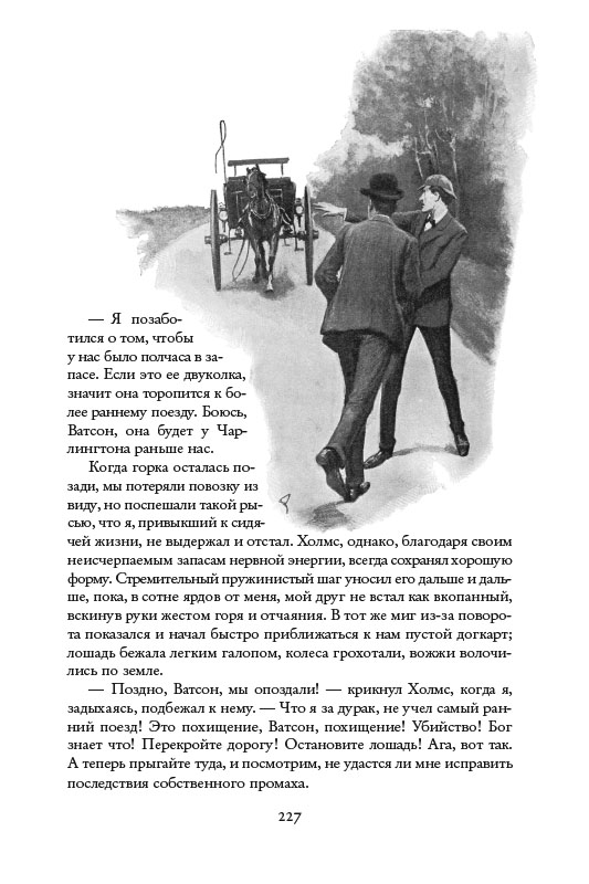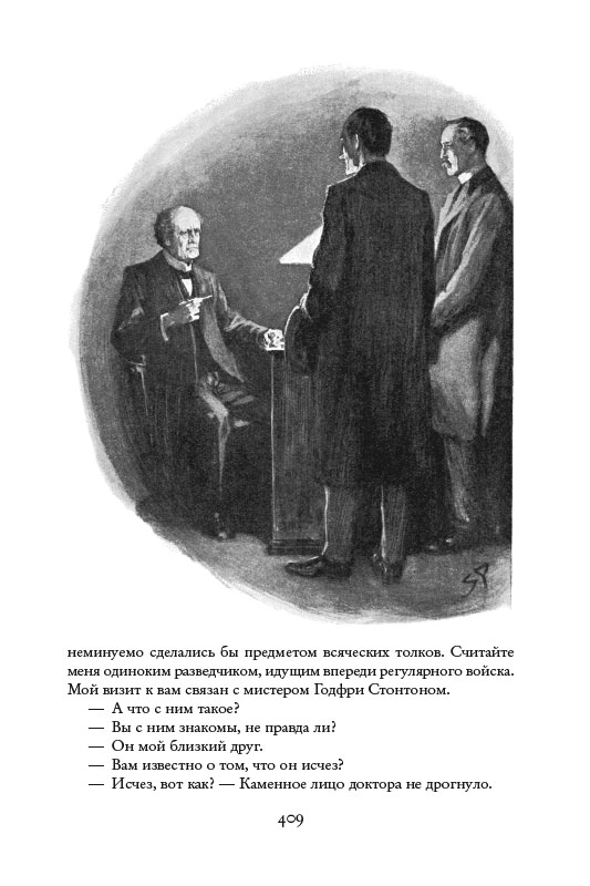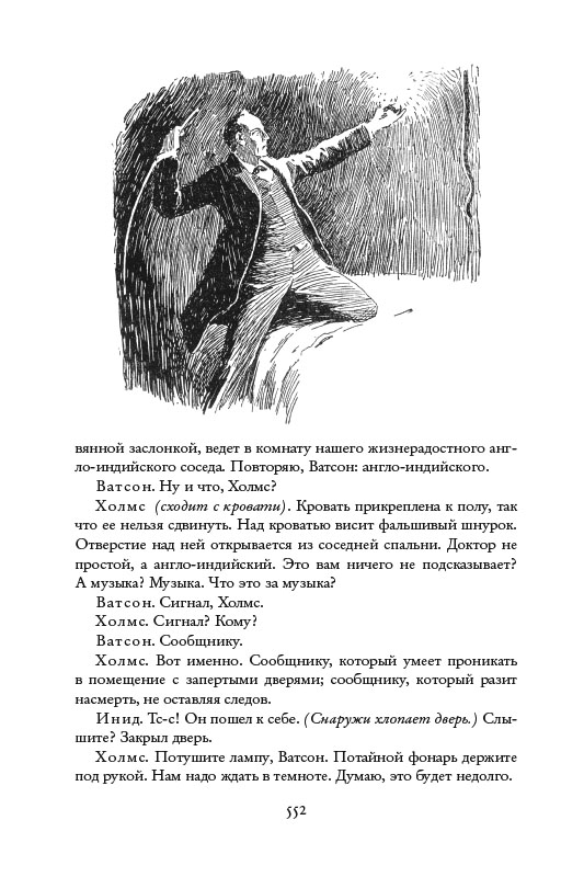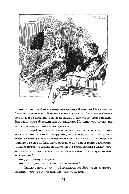 Расскажу о иллюстрациях. "Знак четырех" был написан Конан Дойлем еще до возникновения журнала "Стрэнд", поэтому Сидни Пэджет это произведение не иллюстрировал. Хороших ранних иллюстраций к этой повести просто не существует, при первых изданиях были только рисунки в газете The Bristol Observer в 1890 году — простая газетная графика с посредственной прорисовкой персонажей. Были отдельные неплохие рисунки в некоторых изданиях, но обычно это был лишь рисованный фронтиспис к книге, а внутренние иллюстрации отсутствовали вовсе. Например, такими были рисунки Чарлза Керра (1890) и Артура Твидла (1903) — по одной штуке на книгу. Да и Твидл свою картинку рисовал уже под явным влиянием пэджетовского толкования образа великого сыщика. Иллюстрации же Рихарда Гутшмидта 1902 года, которые мы публикуем в нашей книге, тоже являются "поздними" (по отношению к первым иллюстрациям Пэджета) и потому (как и в случае иллюстраций к "Этюду в багровых тонах") Шерлок Холмс и доктор Ватсон похожи на образы, воплощенные Сидни Пэджетом. Что очень хорошо — ведь мы публикуем в одном томе с "Знаком четырех" еще и сборник "Возвращение Шерлока Холмса", который проиллюстрирован как раз Сидни Пэджетом. Это уже "зрелый" Пэджет — иллюстрации стали более крупными, с гораздо лучшей (по сравнению с первым сборником) прорисовкой мелких деталей. И в нашей книге мы не стали мельчить и пытаться впихнуть текст и иллюстрации в как можно меньший объем — напротив, иллюстрации даны так, чтобы вы могли в полной мере насладиться этими шедеврами мастерства художников, пусть даже это и привело к трате лишней бумаги. Смотрите сами: