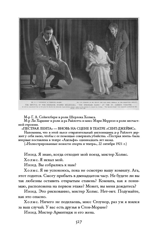Конечно, текст в книге не ограничивается повестью и сборником рассказов! Вы сможете прочитать две пьесы Артура Конан Дойла о Шерлоке Холмсе (обе пьесы, естественно, публикуются в новом переводе тех же мастеров, которые перевели для вас и остальные произведения цикла — Л. Бриловой и С. Сухарева). Всего Конан Дойл написал четыре пьесы по мотивам произведений о Шерлоке Холмсе. Сюжетом для одной из них послужила "мормонская" линия из "Этюда в багровых тонах", Шерлока Холмса там нет вовсе, зато в одном из эпизодов появляется практикующий в Калифорнии доктор Ватсон. Пьеса не была поставлена, а ее текст впервые был опубликован лишь в 2001 году. Еще у одной пьесы судьба печальнее: она не была поставлена, а рукопись сгорела при пожаре. Позже актер Уильям Джиллет написал по мотивам этой пьесы свою собственную, на афишах стояло два имени: его и Конан Дойла. Но, конечно же, это произведение никак нельзя считать авторским по отношению к АКД. Оставшиеся две пьесы — "Дело Стоунор" и "Бриллиант короны" были поставлены еще при жизни писателя, с успехом шли на сцене и тексты именно этих пьес мы предлагаем вашему вниманию.