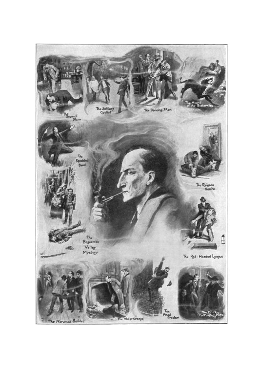 Вот титульные страницы и шмуцтитулы нашей книги. На фронтиспис, как и в прошлом томе, помещен коллаж из иллюстраций Сидни Пэджета к разным рассказам и романам о Шерлоке Холмсе, этот коллаж, созданный Генри Мэтью Броком, впервые был опубликован в журнале "Стрэнд" в 1908 году при издании рассказа "Алое кольцо" (сборник "Его прощальный поклон").