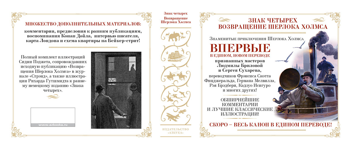 Вот мы добрались и до третьего тома нашего собрания произведений сэра Артура Конан Дойла о знаменитом сыщике Шерлоке Холмсе и его неизменном спутнике и летописце докторе Ватсоне (первые два тома я представлял тут и тут). Этот четырехтомник будет воистину уникальным изданием: все произведения цикла переведены заново Людмилой Бриловой и Сергеем Сухаревым — мастерами, чьи переводы Кадзуо Исигуро и Рэя Брэдбери, Фрэнсиса Скотта Фицджеральда и Чарльза Паллисера, Тома са Де Квинси, Германа Мелвилла и других давно стали классическими. Работу над всеми произведениями цикла курирует один ответственный редактор — и это Александр Гузман, который сам по себе известен великолепными переводами. При этом в каждый том включено множество дополнительных материалов: предисловия к ранним публикациям, воспоминания Конан Дойла, касающиеся тех или иных произведений, некоторые интервью писателя. Плюс каждый том снабжен обширнейшими комментариями и богато иллюстрирован лучшими классическими рисунками.